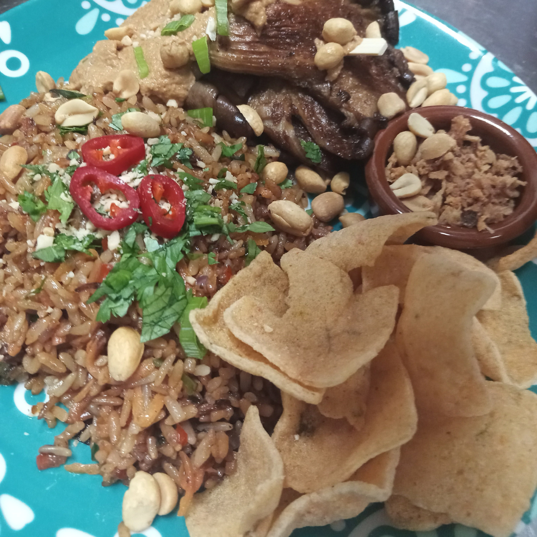 Gebakken oesterzwammen, huisgemaakte pindakaas, pindanootjes, sjalotjes, kokos, knoflook, ketjap manis, chilipeper, prei, wortel, paprika, zilvervliesrijst met koriander