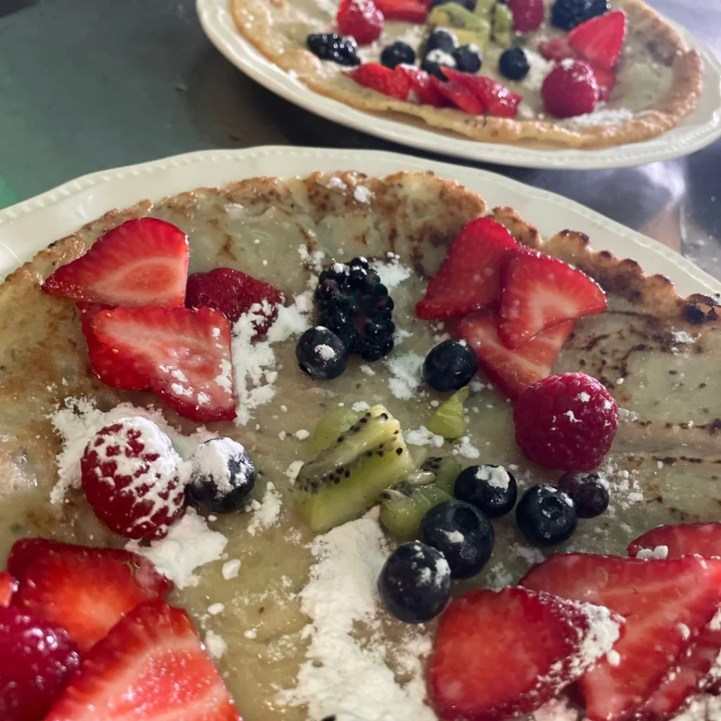 Huisgemaakte pannenkoek, vers fruit & poedersuiker
