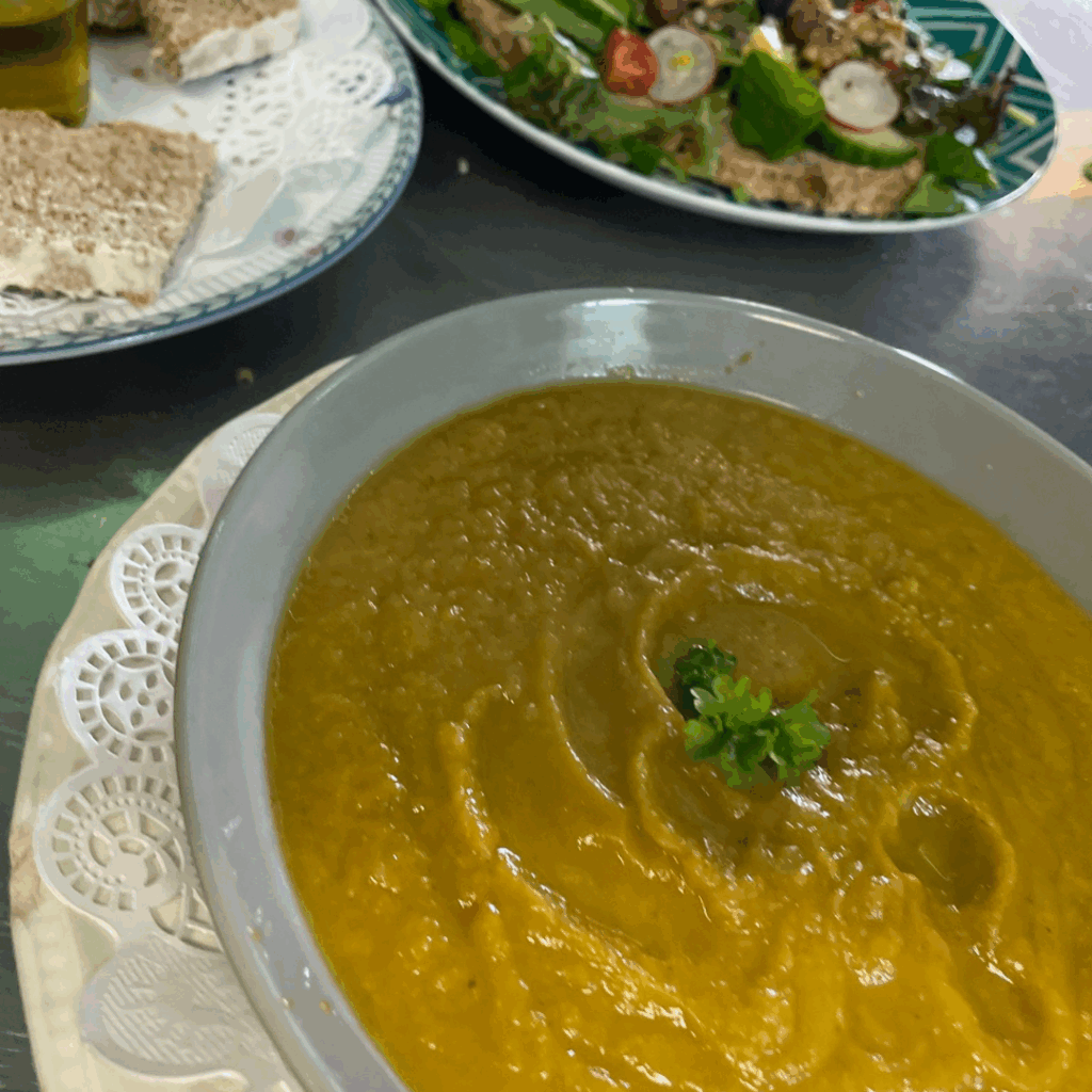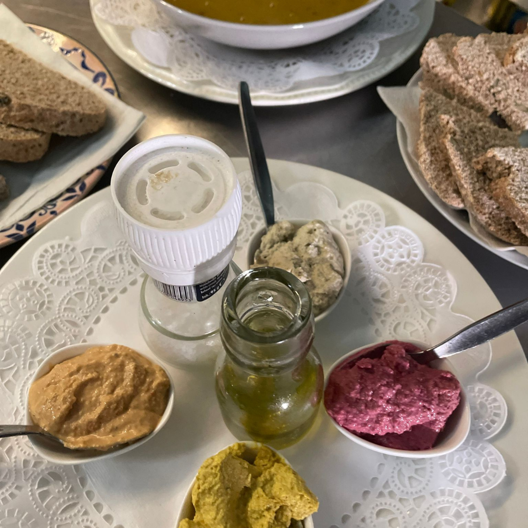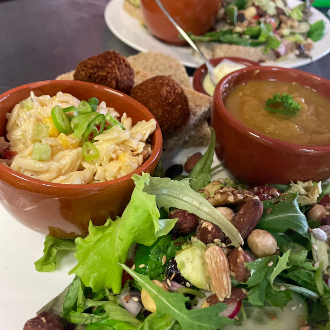 Huisgemaakt brood belegd met gemengde sla, noten & zaden, bolletje koude orsosalade, klein kommetje Chalaza soep.