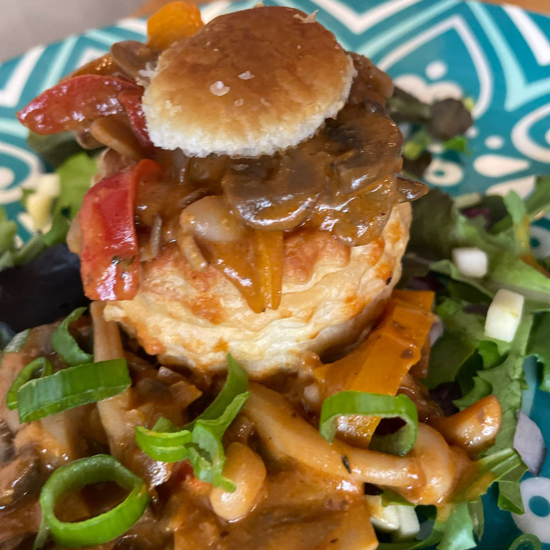 Pasteitje met paddenstoelen stroganoff op een bedje van rucola sla