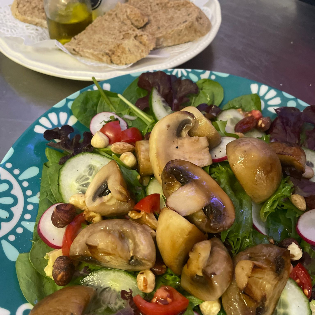 Gepaneerde balletjes van diverse paddenstoelen en walnoten met sjalotjes, oregano, knoflook in een sausje van tomaat, paprika, noten, pitten & zaden Geserveerd met tagliatelle.