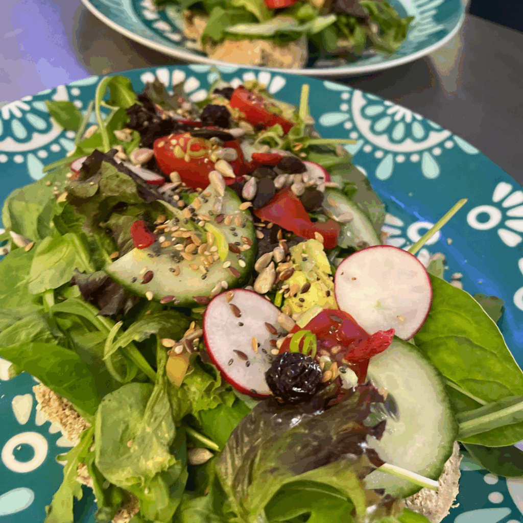 Huisgemaakt brood, rijkelijk belegd met olijfolie, avocado, gemengde sla, tomaat, radijs, komkommer, noten, pitten en zaden.